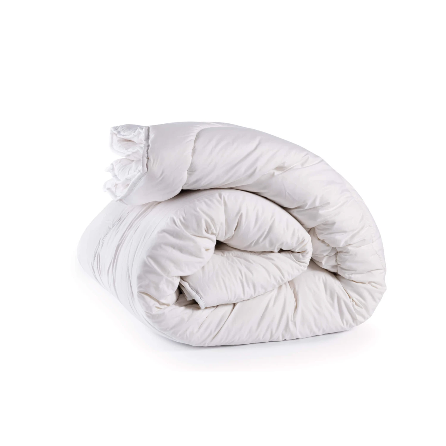 Couette hiver laine vierge 600g. Elle comporte une enveloppe percale 100% coton biologique pour un toucher très doux. Le coton bio est bon pour l’environnement car il n’utilise aucuns produits chimiques néfastes pour notre écosystème (insecticide, pesticide, herbicide). Il est donc plus durable que le coton traditionnel car ses fibres sont mieux préservées.