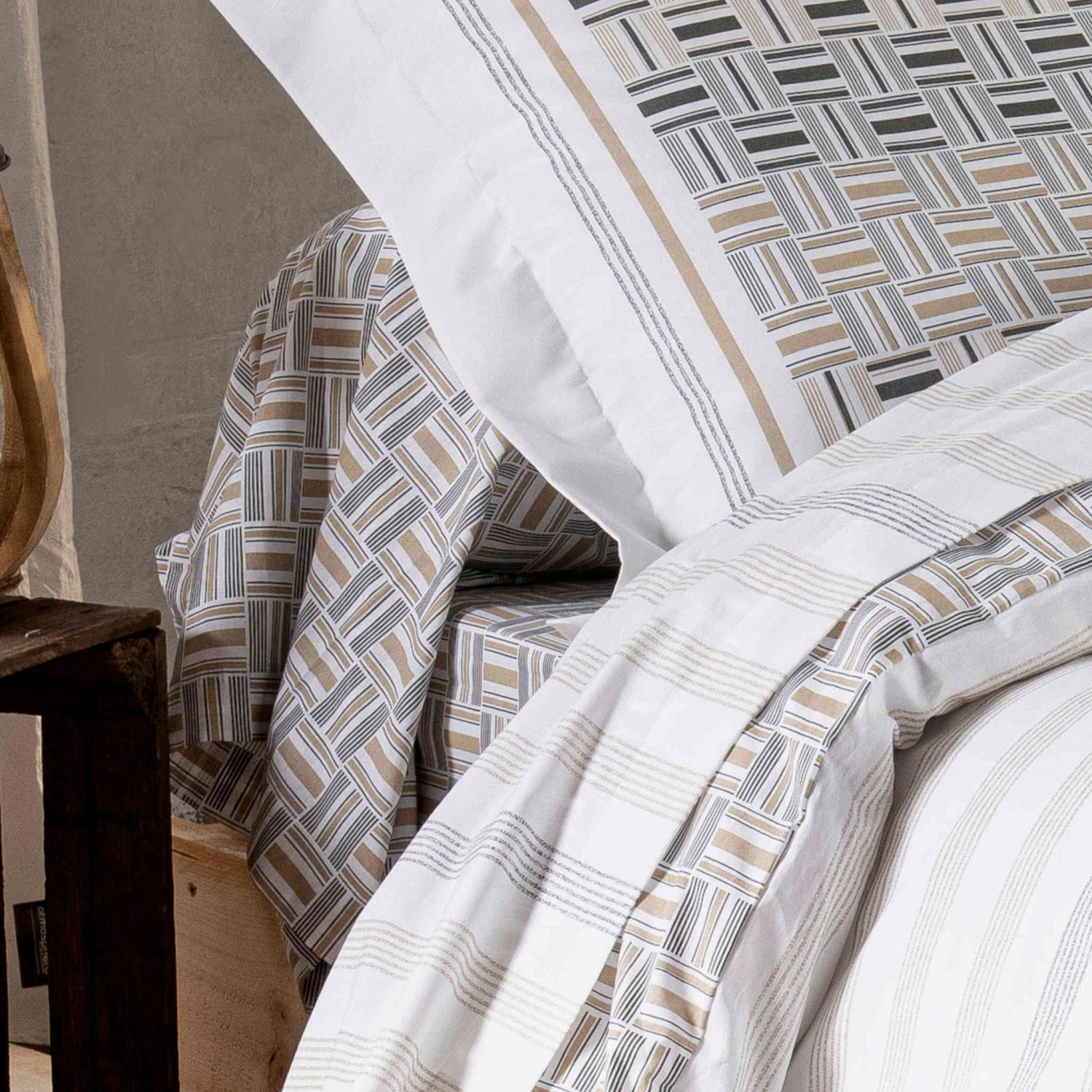 Drap-housse Diego gris bonnet 40 cm – Tradilinge. Le drap-housse Diego Gris présente un imprimé alliant parfaitement design graphique et inspiration ethnique, avec un jeu de motifs géométriques et de fines rayures, dans les tons beiges et gris sur fond blanc. Ses tons neutres permettent ainsi de s’adapter facilement à tous les univers de chambre et de se marier avec tout type de décoration.