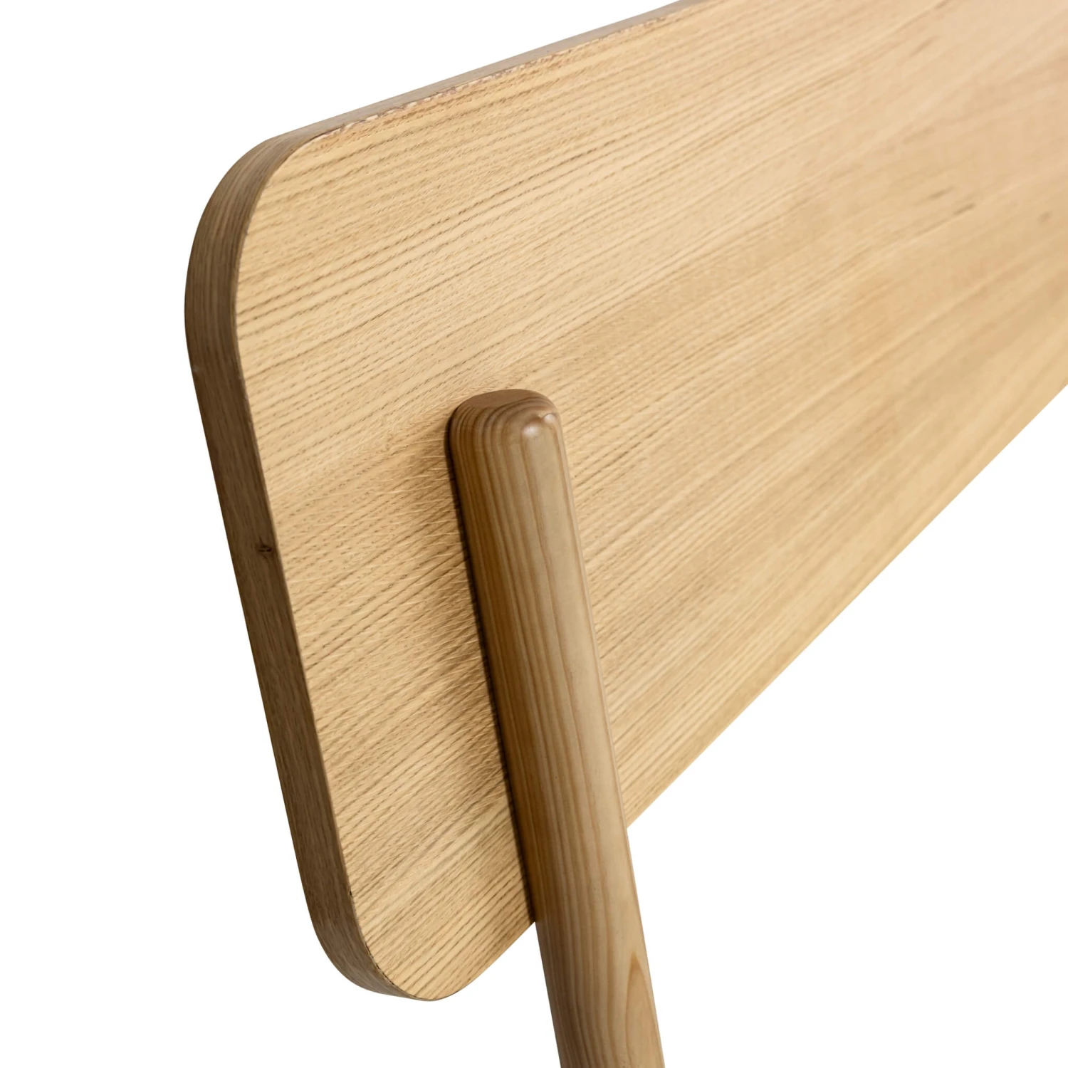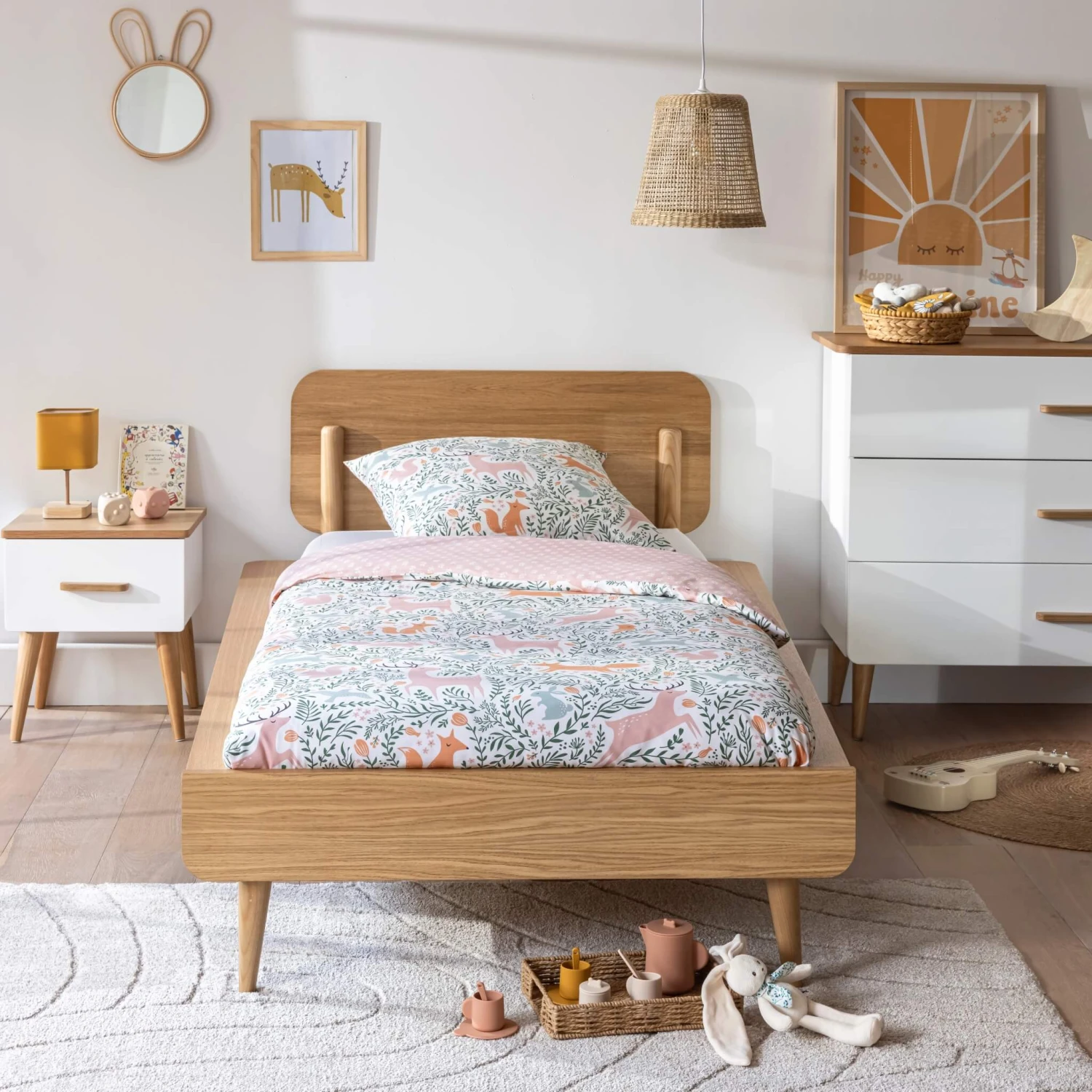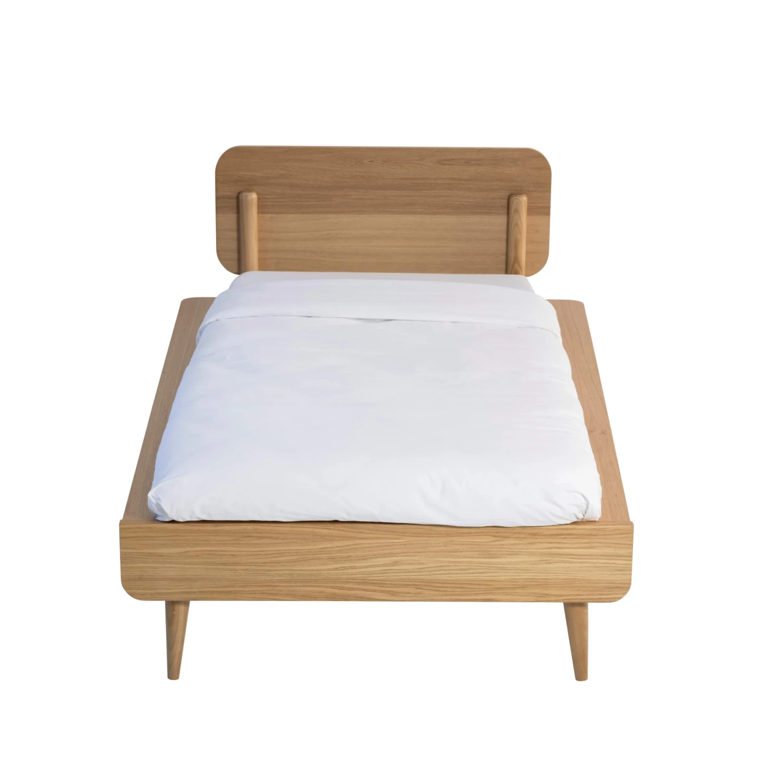 Le lit est fabriqué en panneaux de bois MDF plaquage chêne de haute qualité, assurant ainsi sa robustesse et sa durabilité. Les pieds en pin massif offrent une excellente stabilité. Le lit est proposé avec une tête de lit dans un élégant coloris bois naturel et blanc, qui met en valeur la beauté naturelle du matériau.