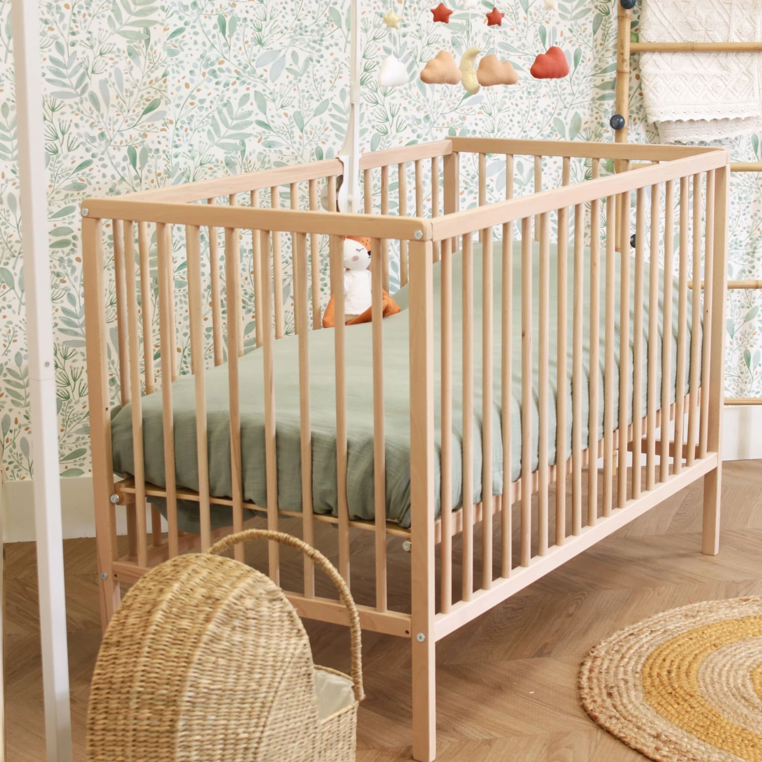 Lit bébé à barreaux en bois massif avec sommier réglable en hauteur 120×60