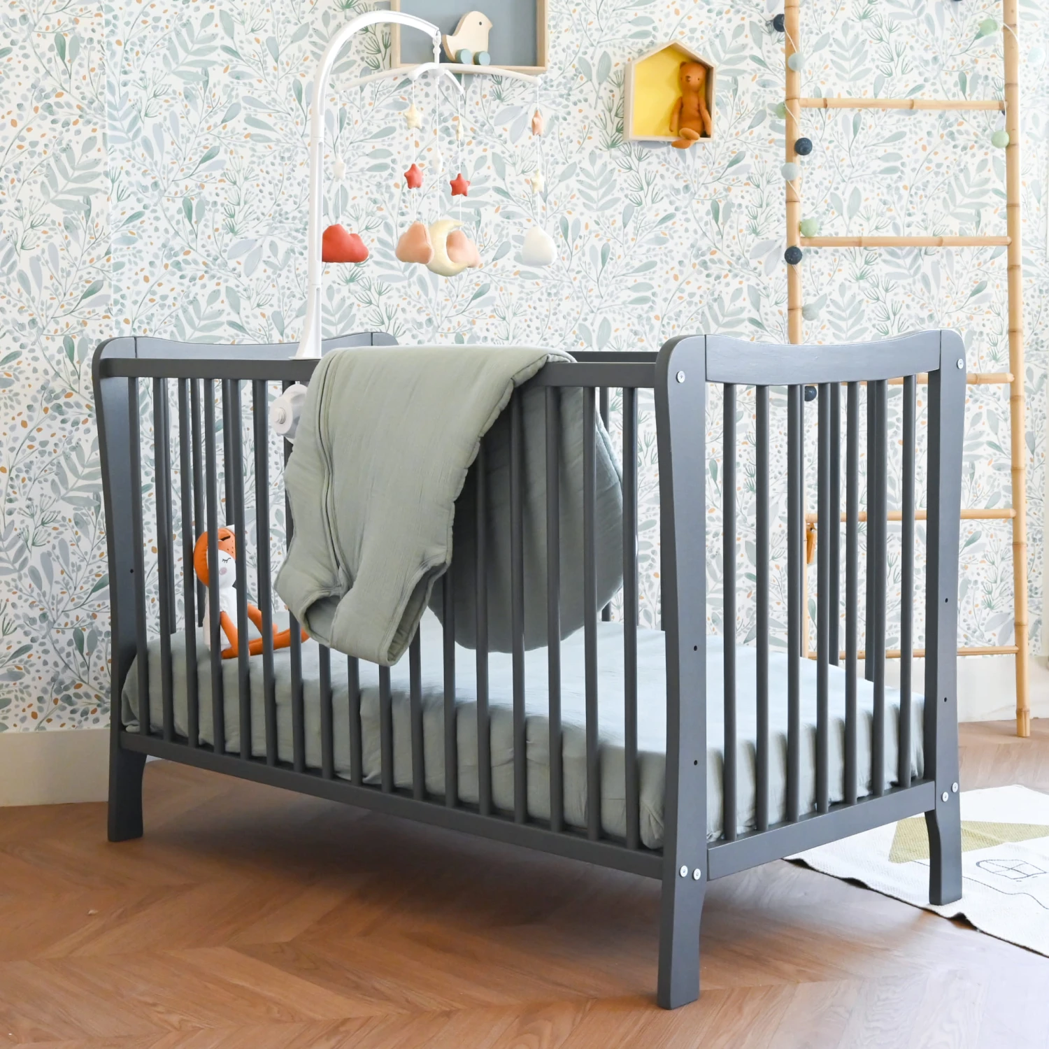 Lit bébé en bois anthracite 60×120 possédant une structure en hêtre massif et un sommier à lattes réglable sur 3 hauteurs. Grâce à son sommier réglable, le coucher de bébé n’en sera que plus facile.