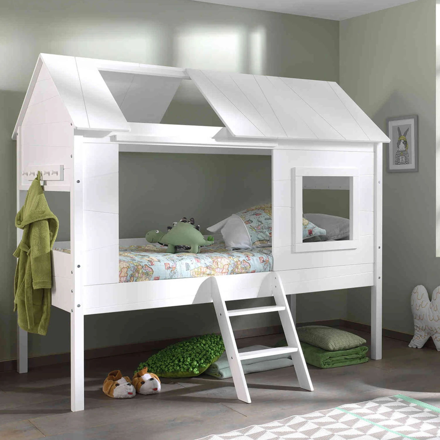 Lit cabane en pin massif et bois MDF de couleur blanche, il est prévu pour accueillir un matelas et sommier de dimensions 90×200 (matelas et sommier en option, non inclus). Enveloppante avec son toit et disposant de fenêtres latérales, cette cabane a tout d’une vraie et sera un formidable terrain de jeux et de rêves pour votre enfant. Il n’y aura pas de décoloration dans le temps grâce à la laque UV. Ce lit conviendra aussi bien pour une chambre de fille que celle d’un garçon.