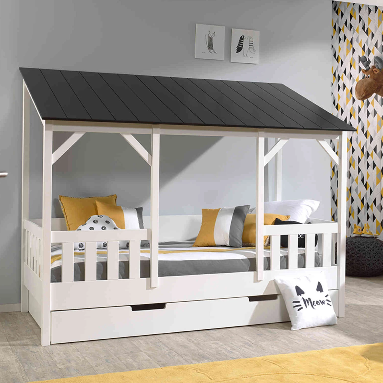 Lit cabane enfant avec toit en bois 90×200 + tiroir de lit
