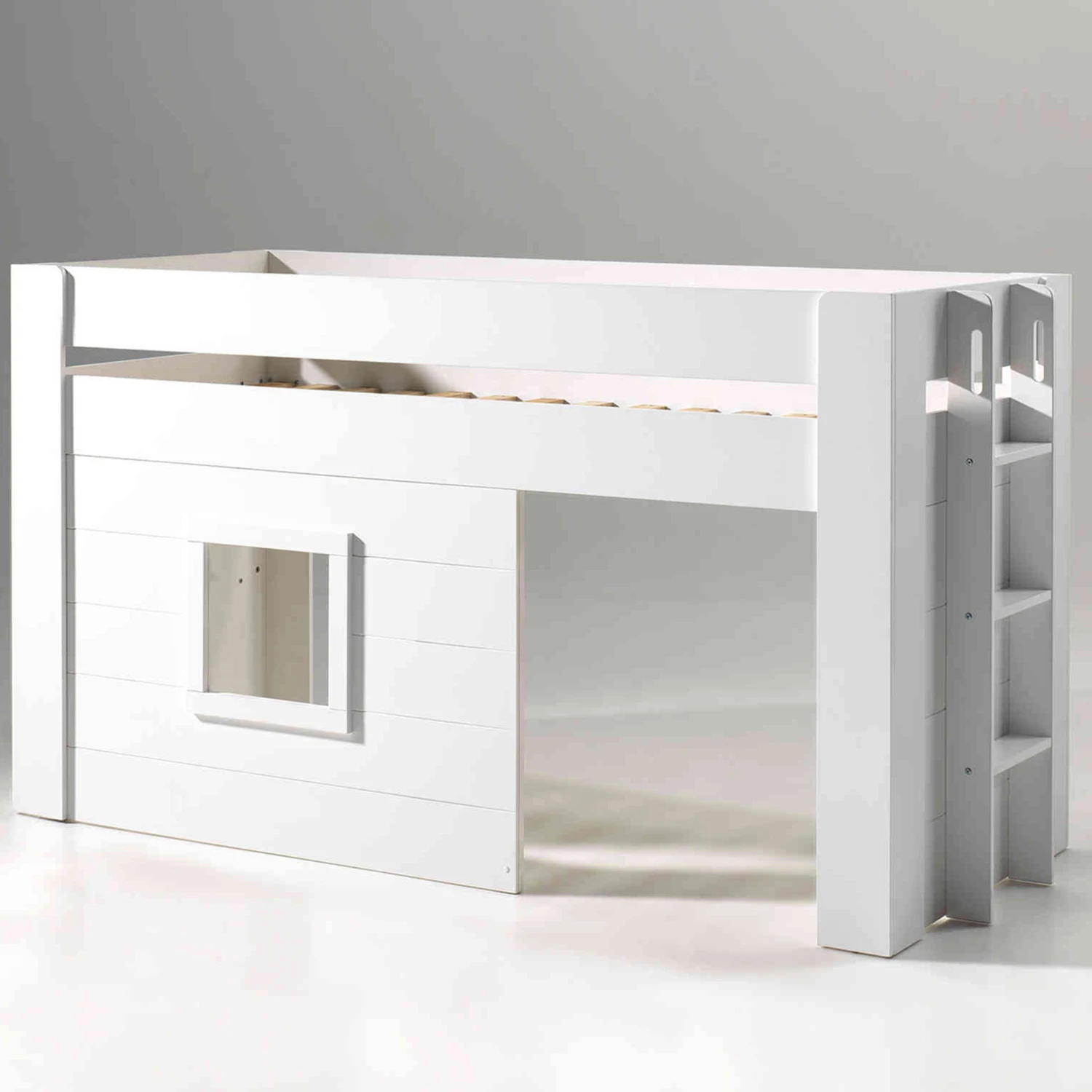 Lit compact enfant 90×200 en bois mdf, blanc laqué. Ce lit avec ses rainures horizontales s’adaptera parfaitement dans la chambre de votre enfant. Il comporte une échelle permettant d’accéder au lit superposé, ainsi qu’un espace avec une porte avec fenêtre intégrée en dessous du lit qui peut être aménagé par votre enfant en mini salle de jeu ou simplement pour ranger ses affaires. La porte peut se fixer d’un côté ou de l’autre du lit. De part sa couleur blanche, ce lit s’adapte parfaitement aux chambres à la fois fille et garçon.