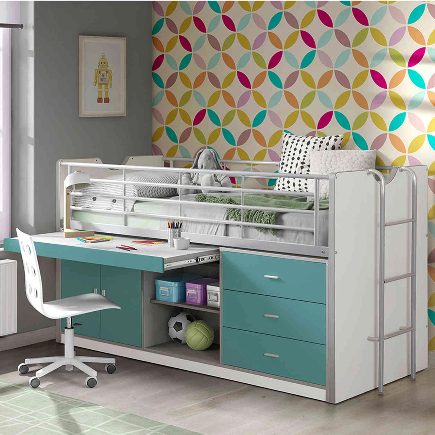 Lit compact enfant 90×200 en bois mdf, turquoise. Il comporte un bureau dépliant sous le lit, une petite armoire 2 portes, et 3 tiroirs permettant à votre enfant de ranger toutes ses affaires de façon ordonnée ! Ce lit comporte également une échelle permettant d’accéder au lit superposé. De part son mélange de couleur turquoise et métal, il s’adaptera parfaitement à la chambre de votre enfant.