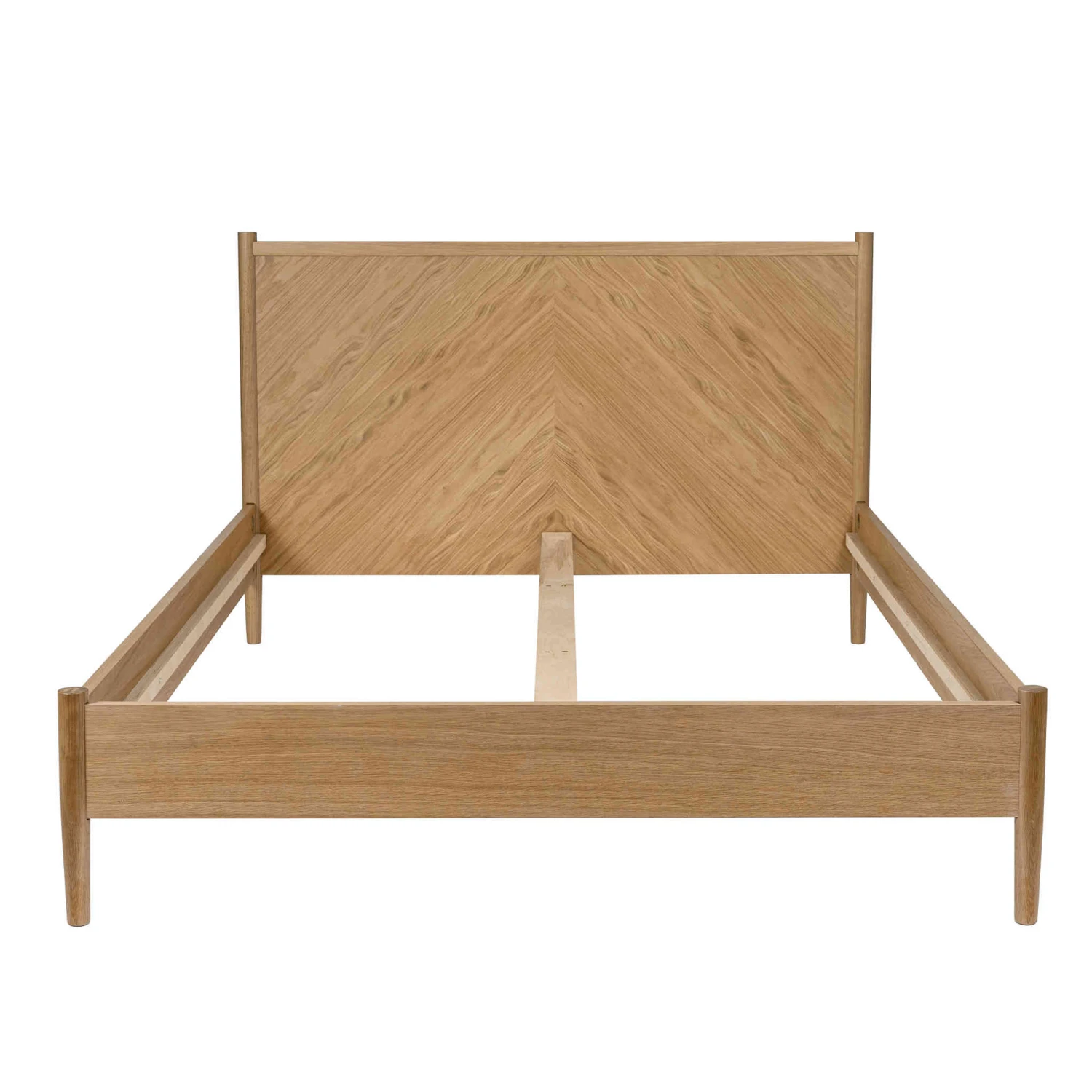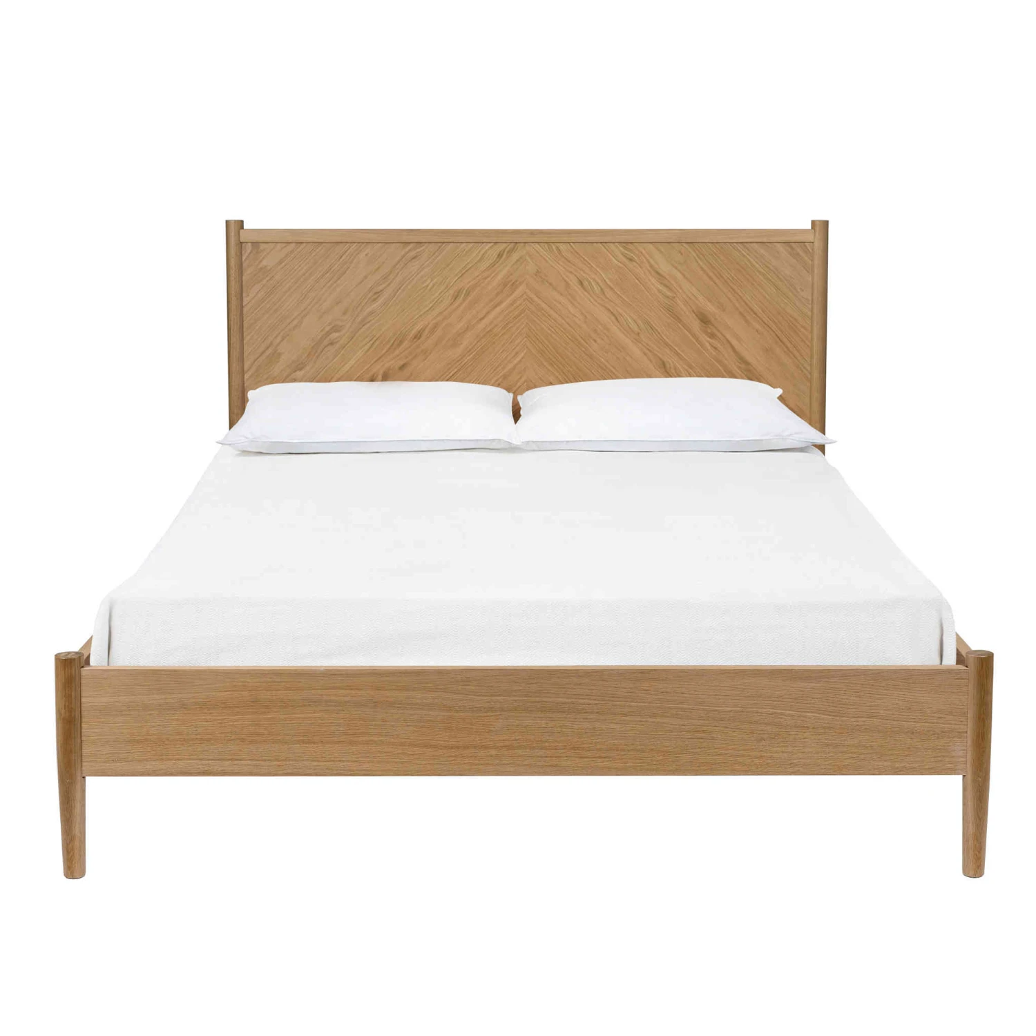 Ce lit possédant une structure plaquée chêne avec des pieds en chêne massif vous assure une qualité exceptionnelle, robuste et durable. Il possède une grande tête de lit avec motif d’angle, permettant de vous adosser et de profiter pleinement de chaque moment de détente.
