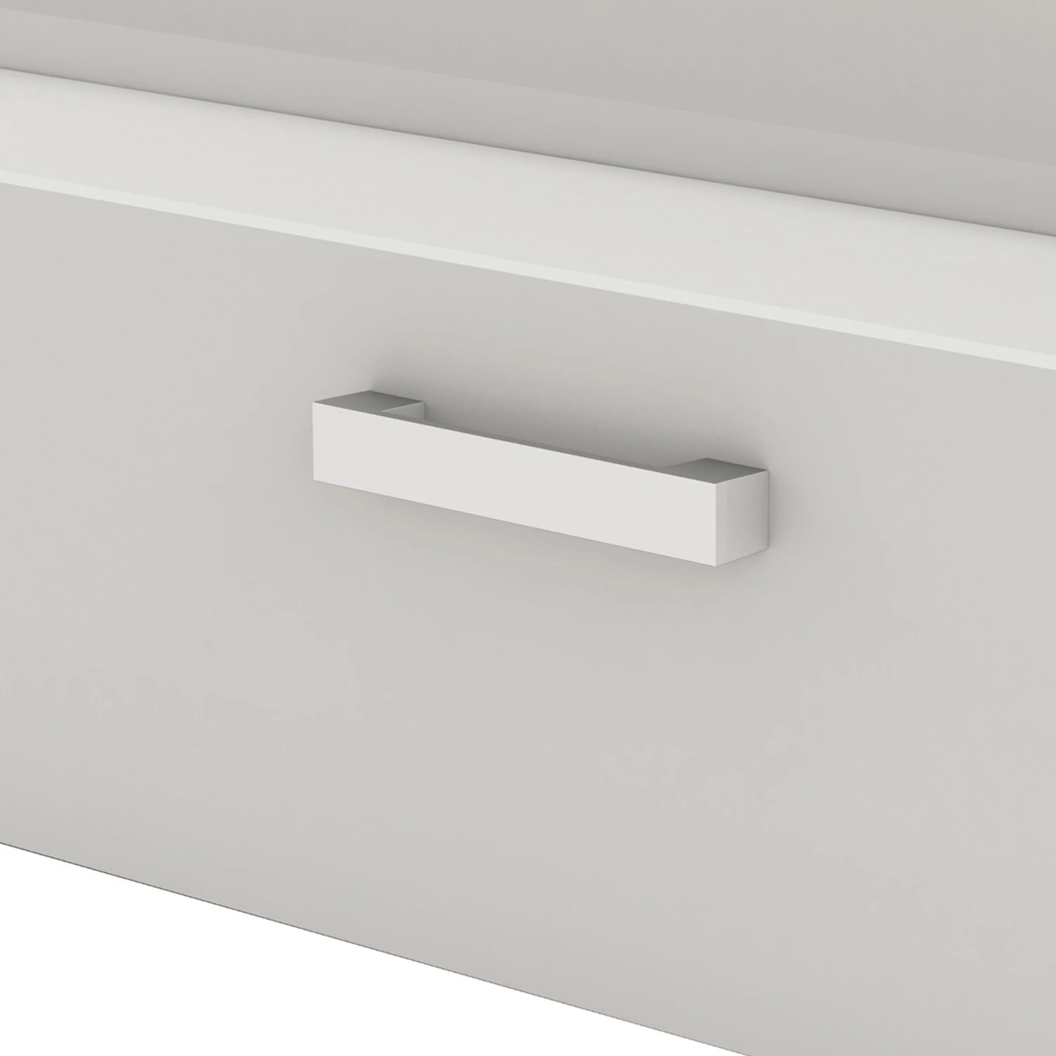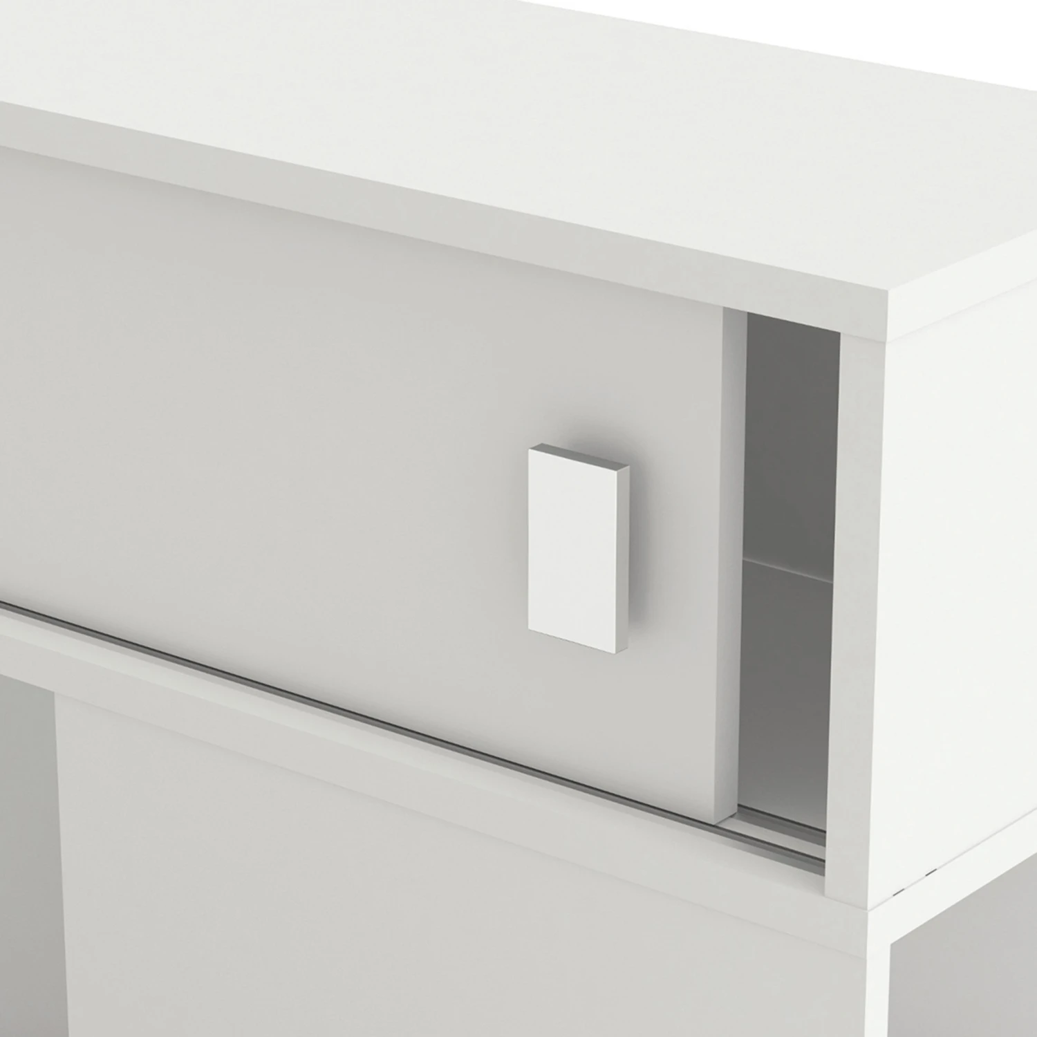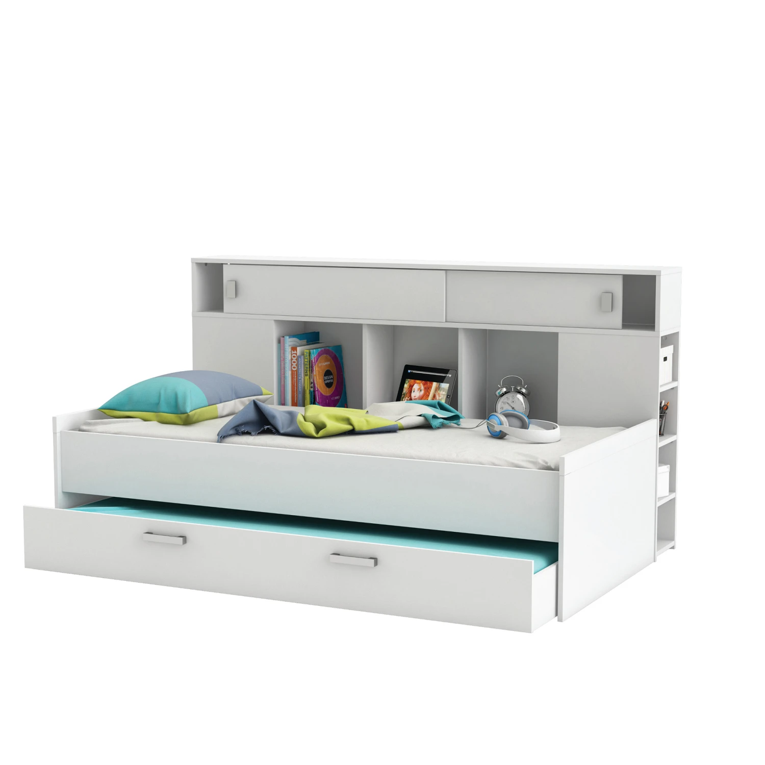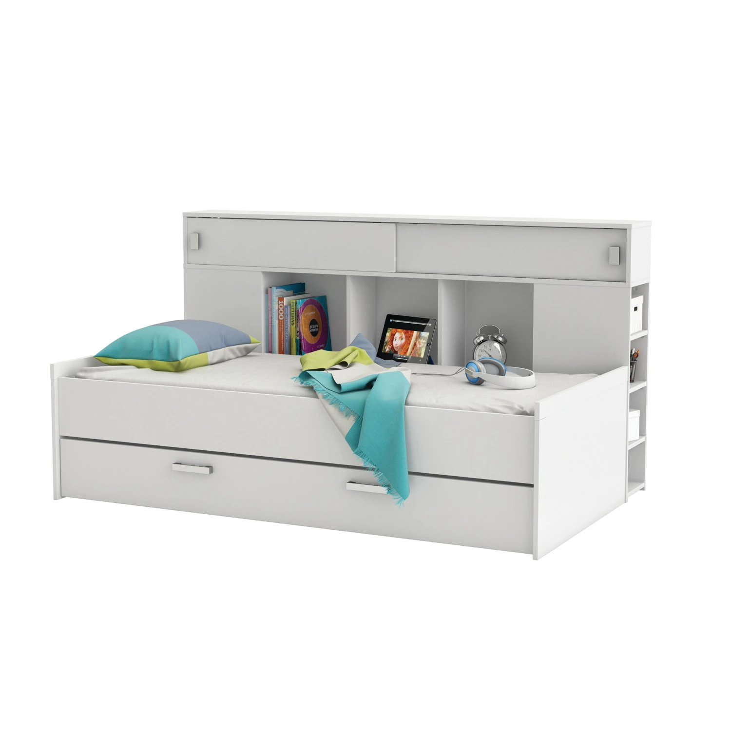 Lit Enfant Gigogne 90×200 en Bois MDF revêtu d’un papier décor imitation Blanc Perle. La structure comporte 4 équerres d’angles afin de recevoir un cadre à lattes de taille 90×200 (sommier en option, non inclus). Ce lit comporte un tiroir de dimension 90×200 cm pouvant servir de second couchage en cas de visite imprévue. Son environnement de lit possède de nombreux espaces de rangements : 2 portes coulissantes renfermant des niches de dimensions 92x21x22 cm, 3 niches centrales de dimensions 41x40x26 cm ainsi que 4 niches latérales. Les poignées des portes et tiroir sont en plastique rectangulaire. Lit ne convenant pas aux enfants de moins de 6 ans.