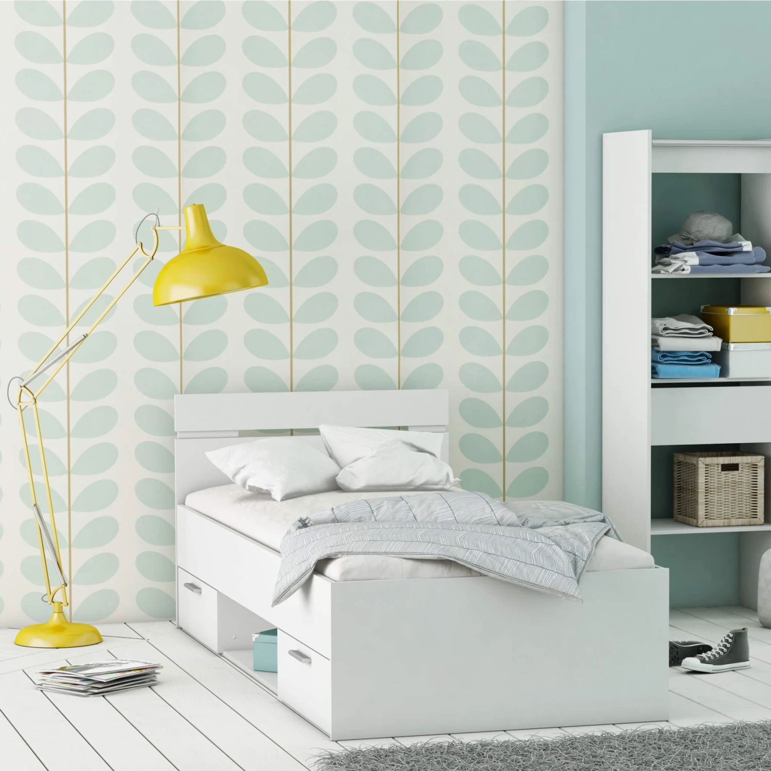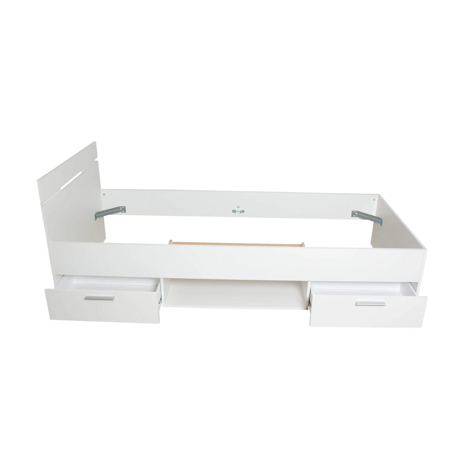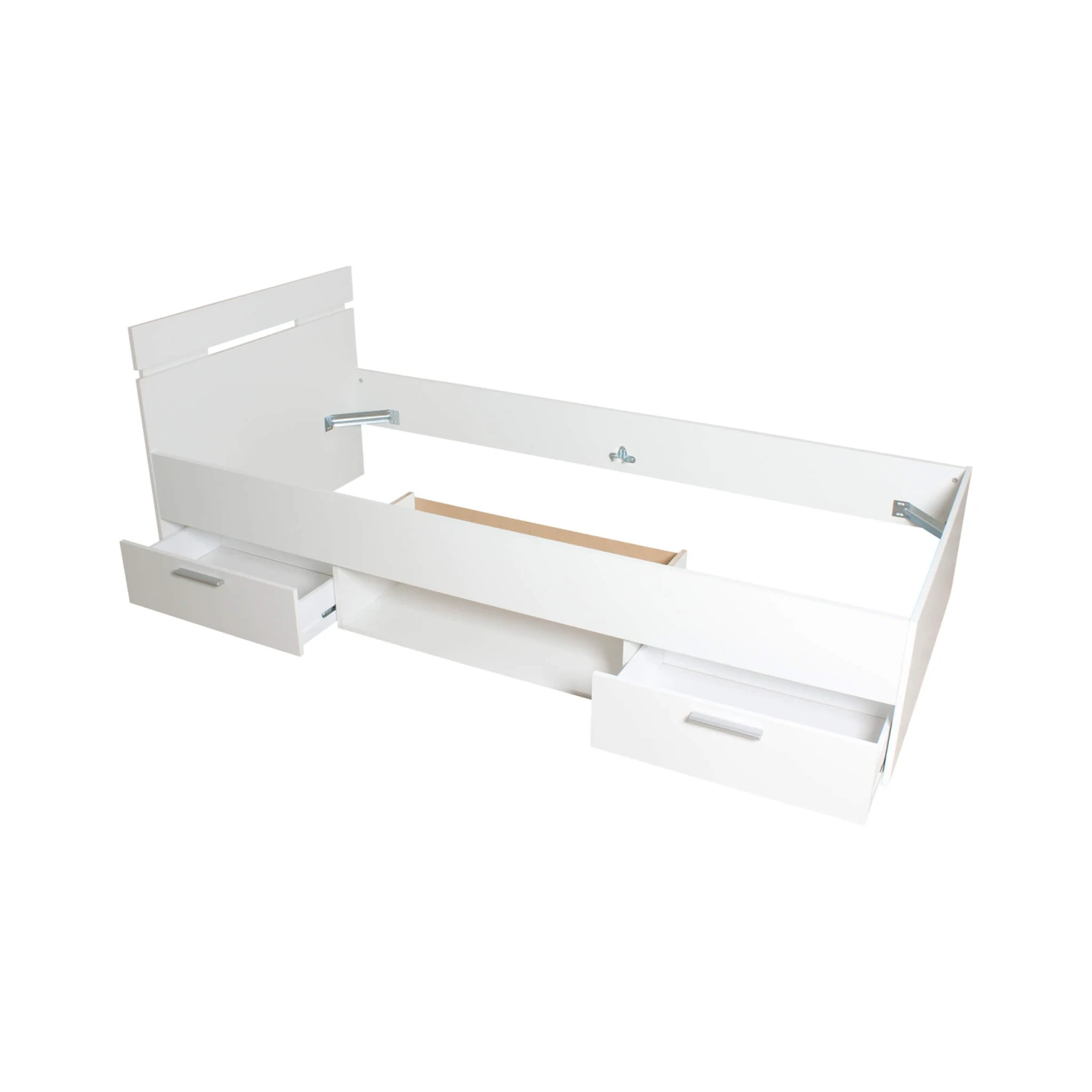 Lit enfant en bois de taille, revêtu de papier décor imitation blanc perle. Il est prévu pour accueillir un matelas et un cadre à lattes de taille (tous les deux en option). Il comporte une tête de lit d’une hauteur de 74.2 cm ainsi que deux grands tiroirs montés sur coulisses à bille de dimensions 56x36x20 cm et une niche de rangement de dimensions 70x36x20 cm permettant d’y ranger les affaires de votre enfant ou tout élément de décoration. Le montage des tiroirs peut se faire à gauche ou à droite selon vos envies.