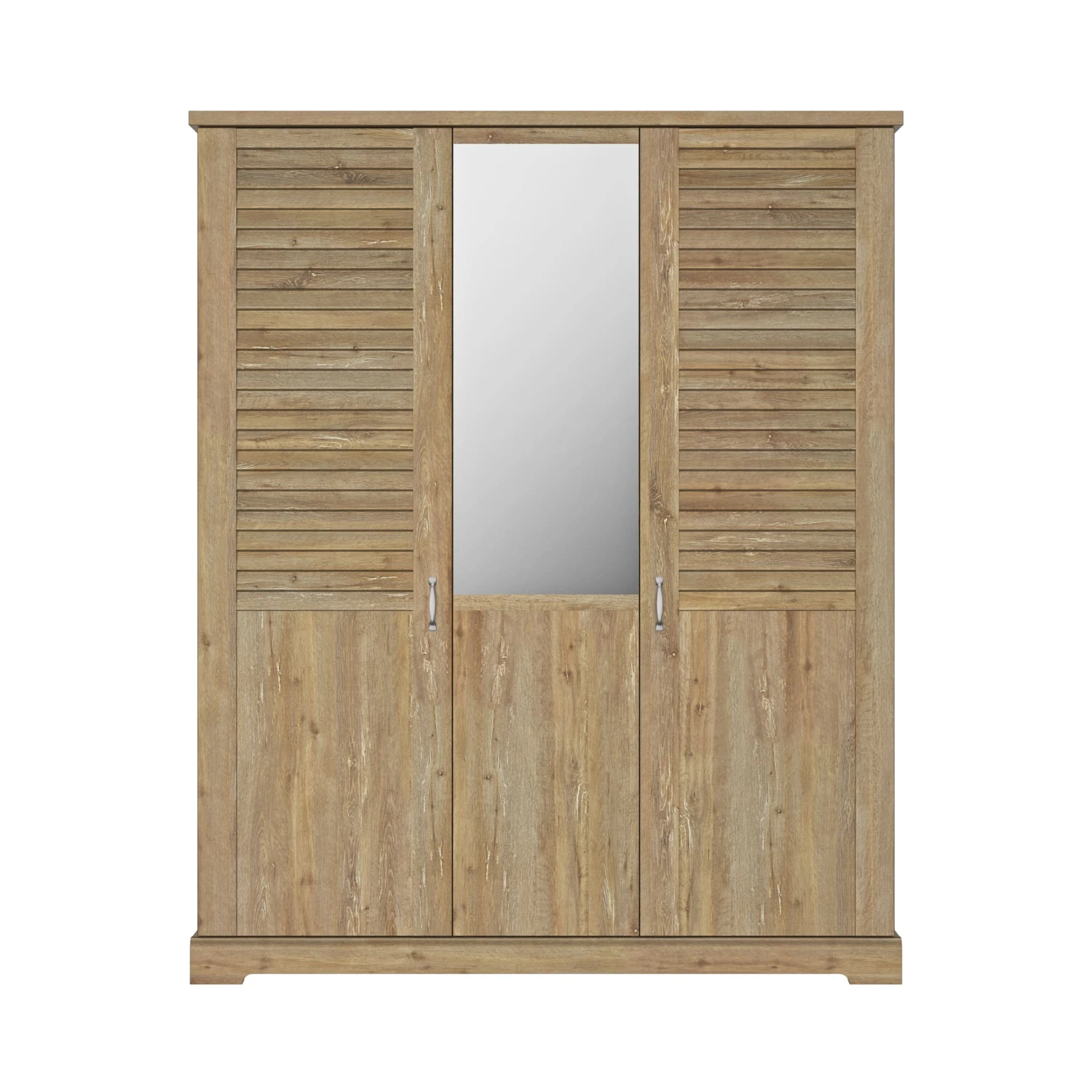 Une belle armoire avec miroir. Elle possède 3 portes dont 2 avec poignées renfermant 5 étagères et 1 barre de penderie permettant d’optimiser le rangement dans votre chambre. Elle vous offre donc 6 espaces de rangement et une penderie (1m20 x 44cm x 1m60 de hauteur). Les niches sont de dimensions 59,4cm x 44,4cm x 40cm de hauteur. Et la niche de la penderie est de dimensions 1m20 x 44cm x 31,5cm de hauteur. Cela vous permettra de ranger toutes vos affaires ou votre linge de lit comme vous le souhaitez. La porte centrale possède un miroir pour faciliter vos essayages. Sa structure en panneaux de particules est montée sur socle. Celle ci est couverte de papier décor ce qui lui donne cet effet châtaignier et un style soigné.