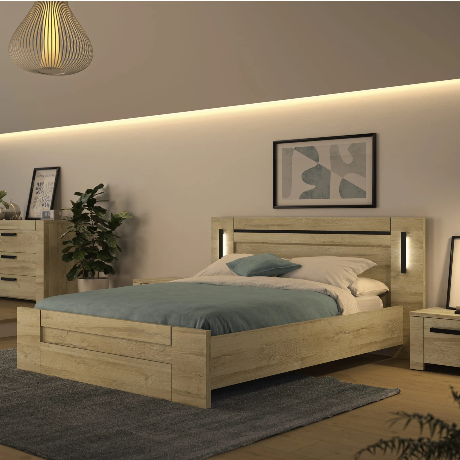 Ce lit en bois est un atout idéal pour sublimer et aménager votre chambre. Il possède une jolie tête de lit qui apporte style et confort. Celle-ci comprend 2 éclairages liseuses rectangles tactiles vous offrant une lumière tamisée. Ils sont simples d’utilisation pusqu’il suffit de toucher la partie métallique pour régler la luminosité (4 niveaux d’intensité). Sa structure en panneaux de particules garantit une structure solide, de plus il est de fabrication française garantissant des finitions de qualité. Le tout avec une finition chêne doré agrémentée de noir, ce qui lui apporte ce style moderne et élégant.
