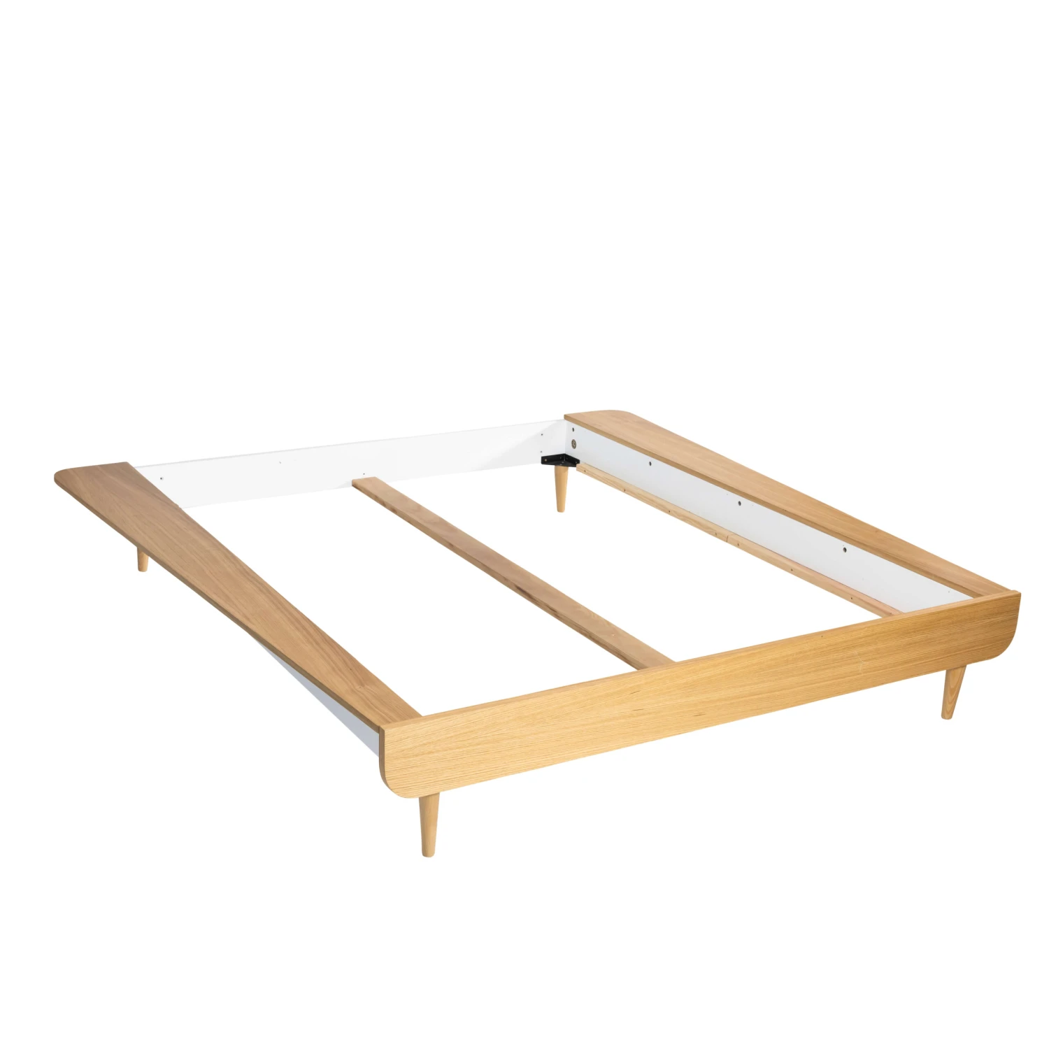 Le lit est fabriqué en panneaux de bois MDF plaquage chêne de haute qualité, assurant ainsi sa robustesse et sa durabilité. Les pieds en pin massif offrent une excellente stabilité. Le lit est proposé dans un élégant coloris bois naturel, qui met en valeur la beauté naturelle du matériau.