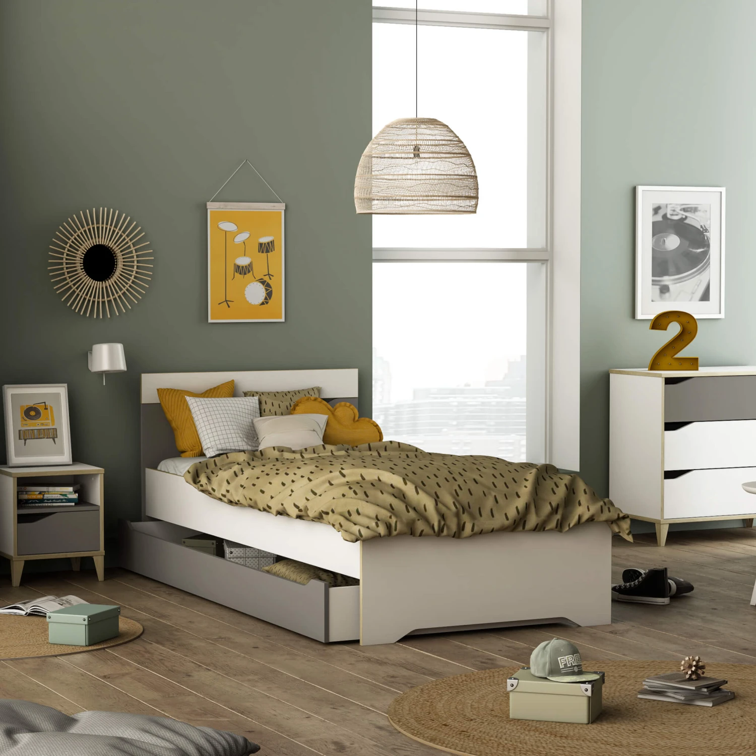 Lit tiroir enfant en bois blanc et gris 90×190/200 – LT221