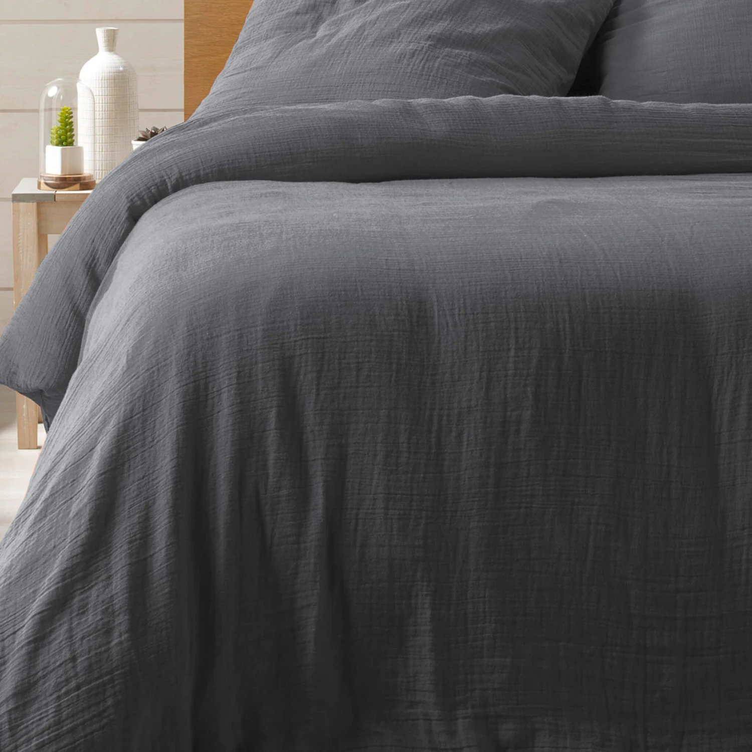 Parure de lit double gaze de coton anthracite Angelia. Grâce à sa matière double gaze de coton présente sur une face de la housse, cette parure de lit vous offre un confort exceptionnel et un toucher ultra-doux, pour votre plus grand plaisir et bien-être. En effet, le double gaze de coton est reconnu comme étant un tissu très doux, fin et léger, avec un effet froissé et aérien, idéal pour profiter de nuits très confortables et paisibles. De plus, cette parure de lit présente un joli coloris anthracite qui s’adapte facilement à tout type de décor !