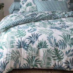 Composée en 100% coton 42 fils/cm², la parure de lit comprend la housse de couette en finition pressions ainsi qu’une taie d’oreiller 63×63.