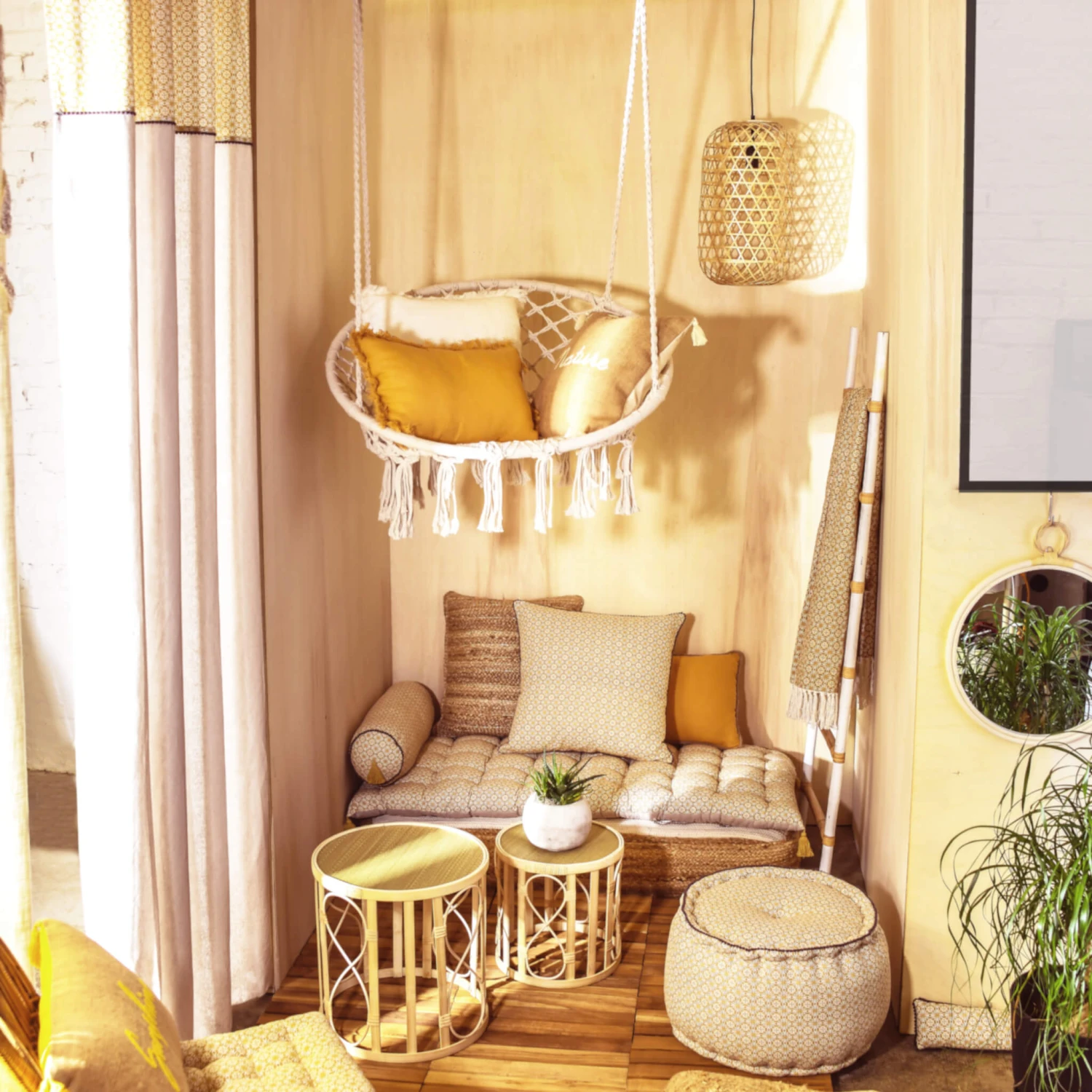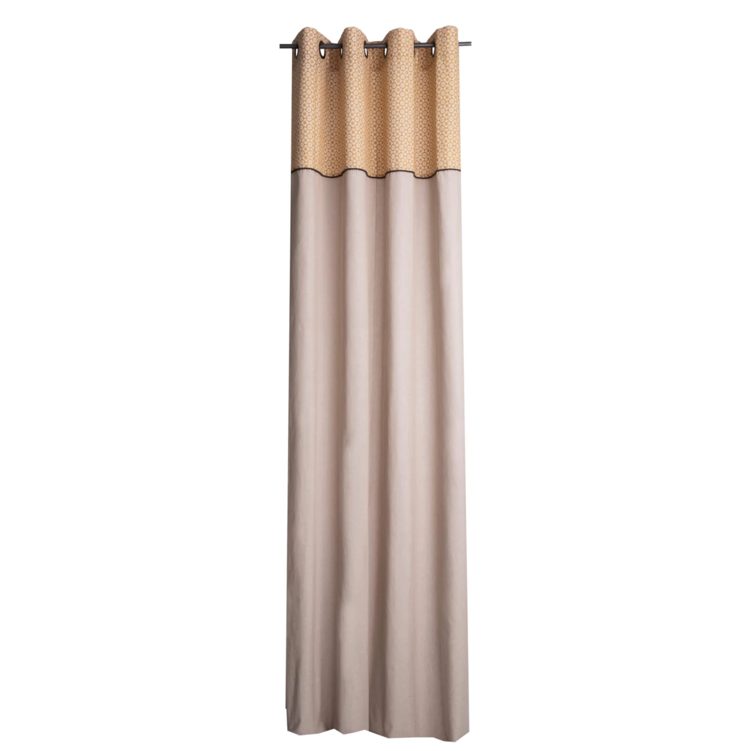 En matière de design, vous retrouverez une surface unie ainsi que des motifs dans un style bohème sur le haut du rideau.