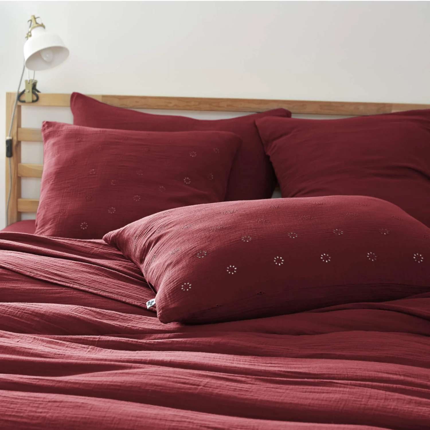 Disponible dans plusieurs coloris, cette taie d’oreiller bordeaux est proposée