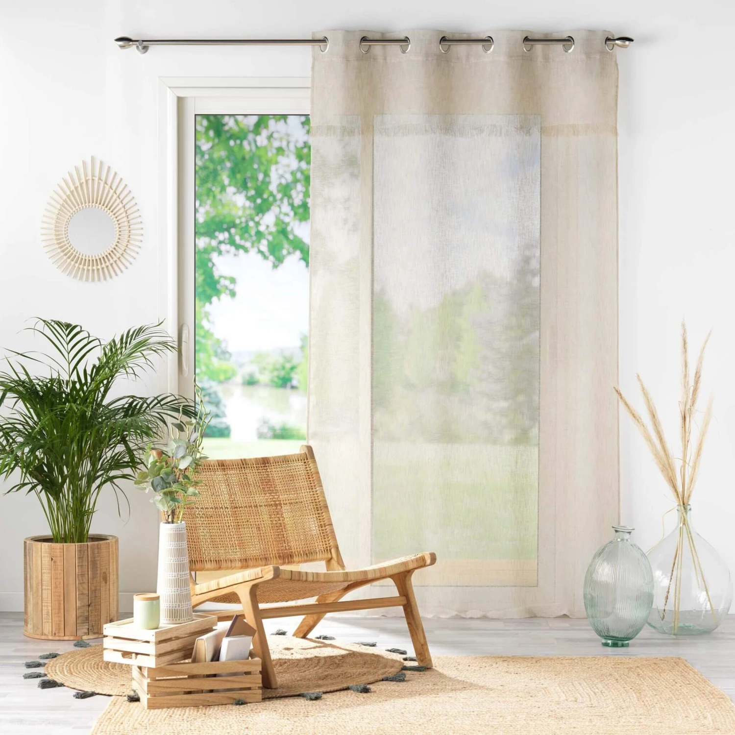 Voilage à oeillets Eleania 140×240, de la marque Douceur D’intérieur. De couleur lin, ce voile permet d’ajouter une touche de clareté et de modernité à votre pièce tout en vous garantissant une intimité vis-à-vis des regards extérieurs. La particularité du voilage est sa propriété tamisante, qui lui permet de filtrer la lumière du jour.